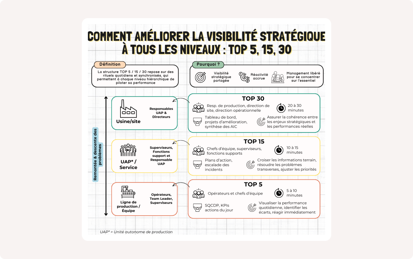 Inspirée des principes du Lean, la structure TOP 5 / 15 / 30 repose sur des rituels quotidiens et synchronisés, qui permettent à chaque niveau hiérarchique de piloter sa performance, d’aligner ses actions avec les objectifs globaux, de faire remonter les problèmes, et de prendre des décisions rapides et efficaces.