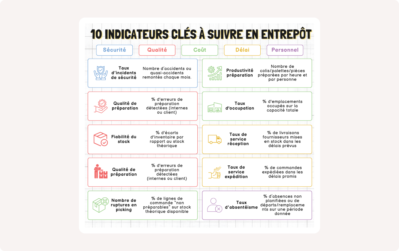 Voici donc, pour chacune de ces dimensions, les indicateurs que je vous recommande de suivre pour piloter et améliorer votre performance en entrepôt.