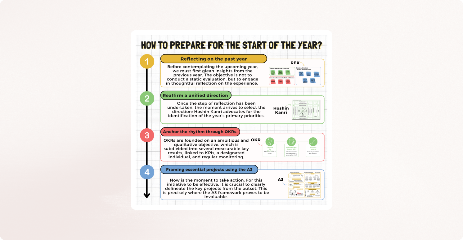 What worked well? Where did we make progress? Which dysfunctions were tolerated? What did we learn collectively during difficult moments? My advice: take the time to run a closing ritual with your teams. The objective is to surface lessons learned and unspoken frustrations. This raw material is what allows you to build a genuine continuous improvement dynamic. Kaizen always starts with a posture of self questioning, even and especially when everything seems to be going well.
